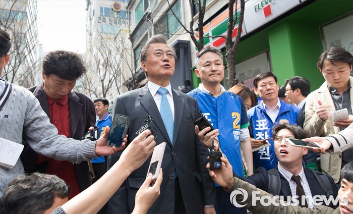 (용인=포커스뉴스) 6일 오전 경기 용인 기흥구 보정동 카페거리에서 문재인 더불어민주당 전 대표가 표창원 더민주 용인시정 후보 지원유세 중 취재진 질문에 답하고 있다.