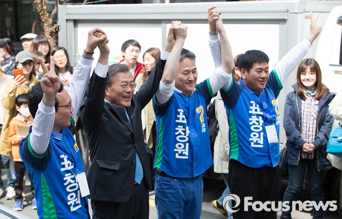 (용인=포커스뉴스) 6일 오전 경기 용인 기흥구 보정동 카페거리에서 문재인 더불어민주당 전 대표가 표창원 더민주 용인시정 후보 지원유세를 하고 있다.