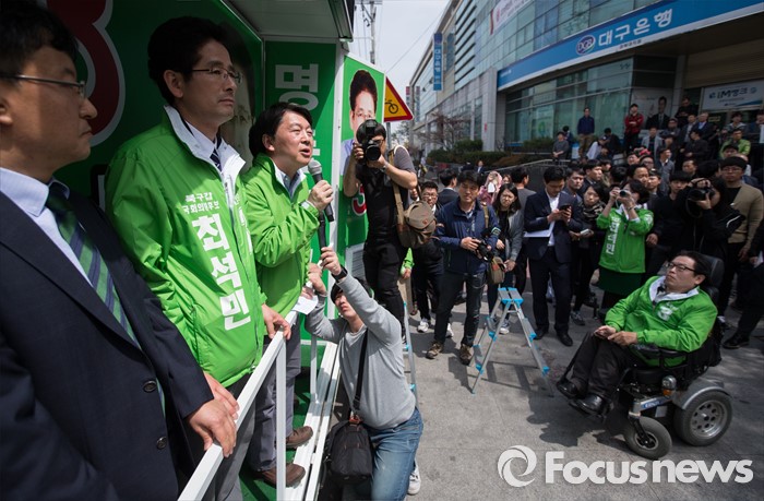 (대구=포커스뉴스) 안철수 국민의당 상임공동대표가 6일 오후 대구광역시 북구 경북대학교 앞에서 최석민 대구 북구갑 후보 지원유세를 하고 있다.