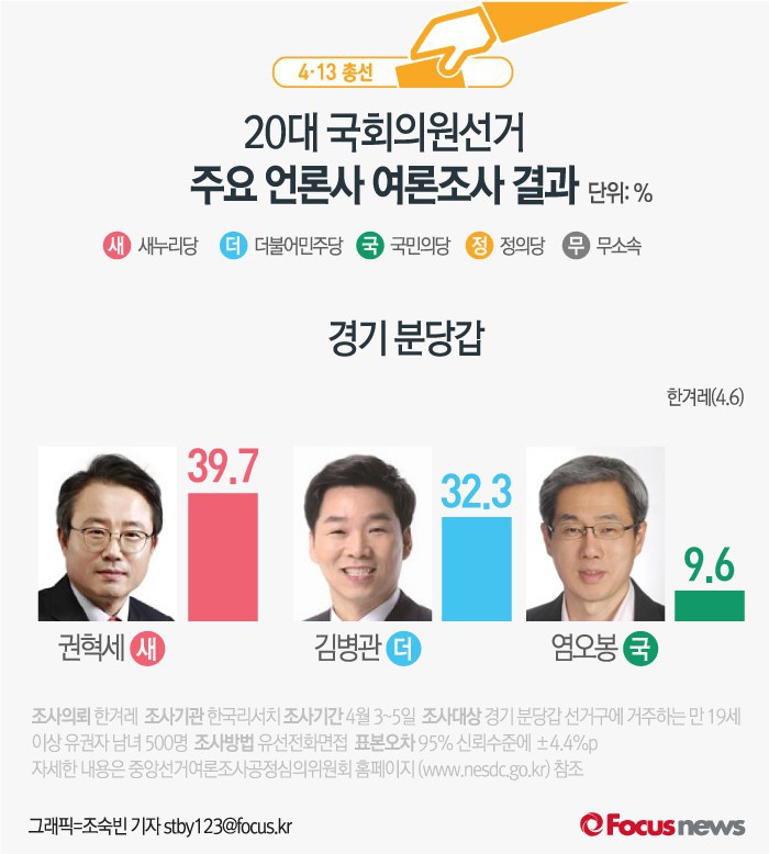 (서울=포커스뉴스) 한겨레가 여론조사기관 한국리서치에 의뢰해 6일 발표한 결과에 따르면 경기 분당갑의 지지율은 새누리당 권혁세 후보(39.7%), 더민주 김병관 후보(32.3%), 국민의당 염오봉 후보(9.6%) 순인 것으로 나타났다.