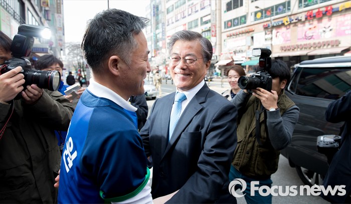 (용인=포커스뉴스) 6일 오전 경기 용인 기흥구 보정동 인근에서 문재인 더불어민주당 전 대표와 표창원 더민주 용인시정 후보가 거리유세에 앞서 인사를 하고 있다.