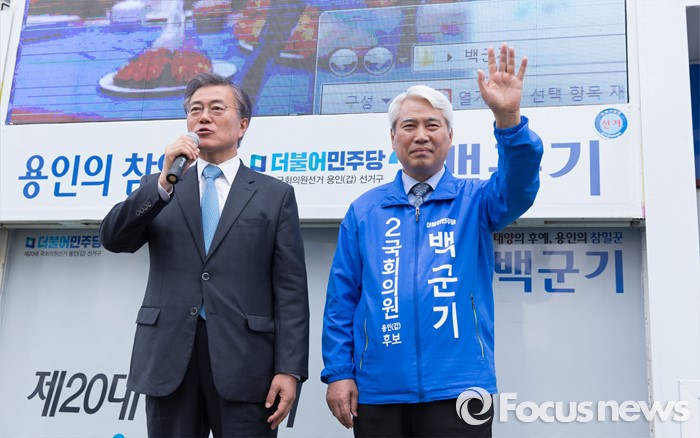 (용인=포커스뉴스) 6일 오후 경기 용인 처인구 김량장동 롯데시네마 앞에서 문재인 더불어민주당 전 대표가 백군기 더민주 용인시갑 후보 지원유세를 하고 있다.