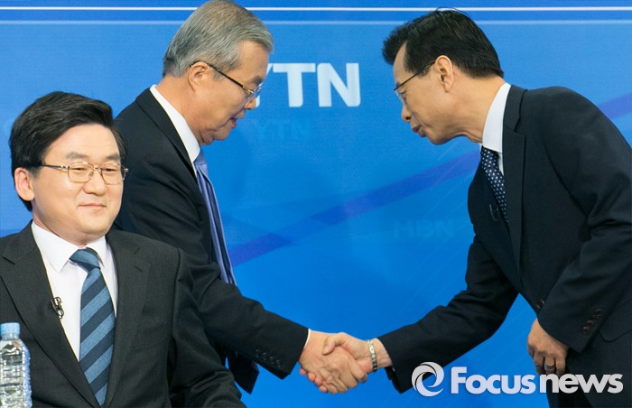 (서울=포커스뉴스) 김종인(왼쪽 두번째) 더불어민주당 비대위 대표 겸 선대위원장이 6일 오후 서울 종로구 세종문화회관에서 열린 한국방송기자클럽 초청 토론회에 참석해 패널들과 인사하고 있다.