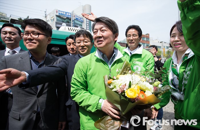 (대구=포커스뉴스) 안철수 국민의당 상임공동대표가 6일 오후 대구광역시 북구 경북대학교 앞에서 최석민 대구 북구갑 후보 지원유세를 하고 있다.