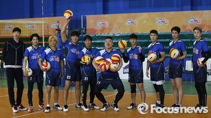 (서울=포커스뉴스) 6일 오후 서울 강서구 KBS스포츠월드에서 열린 예능프로그램 '우리동네 예체능' 촬영현장 공개 행사에 참여한 출연진들이 포토타임을 갖고 있다. 왼쪽부터 배구감독 김세진, 배우 오타니 료헤이, 가수 강남, 배우 이재윤, 오만석, 방송인 강호동, 가수 조타, 배우 조동혁, 학진, 래퍼 슬리피.