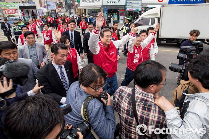 (당진=포커스뉴스) 6일 오후 충남 당진 구 버스터미널 사거리에서 김무성(오른쪽) 새누리당 대표가 김동완 당진시 후보 지원유세를 하고 있다.