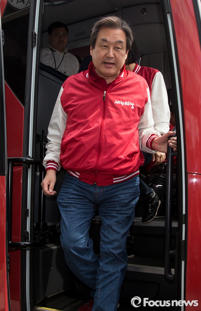 (당진=포커스뉴스) 6일 오후 충남 당진 구 버스터미널 사거리에서 김무성 새누리당 대표가 김동완 당진시 후보 지원유세를 위해 버스에서 내리고 있다.