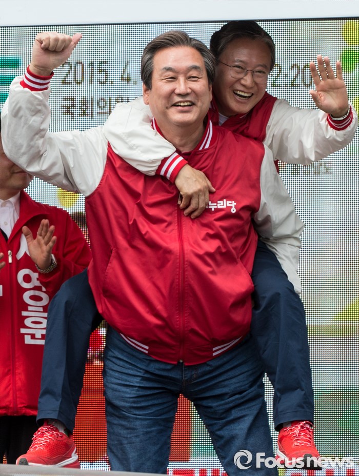 (당진=포커스뉴스) 6일 오후 충남 당진 구 버스터미널 사거리에서 김무성(오른쪽) 새누리당 대표가 김동완 당진시 후보 지원유세를 마친 후 김 후보를 업어주고 있다.