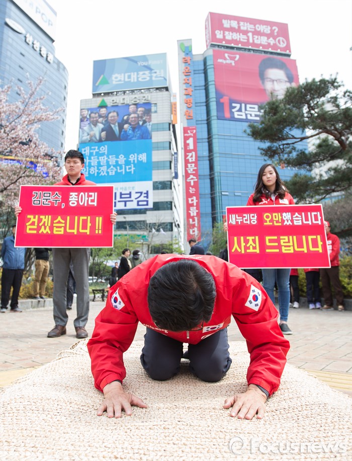 (대구=포커스뉴스) 김문수 새누리당 수성구갑 후보가 6일 오후 대구광역시 수성구 범어네거리에서 새누리당 공천 잘못과 대구 경제 못 살린것을 사죄한다며 절을 하고 있다.