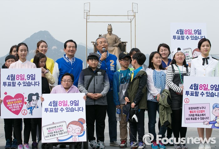 (서울=포커스뉴스) 김종인 더불어민주당 비대위 대표 겸 선대위원장이 6일 오후 서울 광화문광장에서 정세균 종로구 후보, 비례대표 후보, 창원 봉강초등학교 학생들과 20대 총선 사전투표 캠페인을 하고 있다.