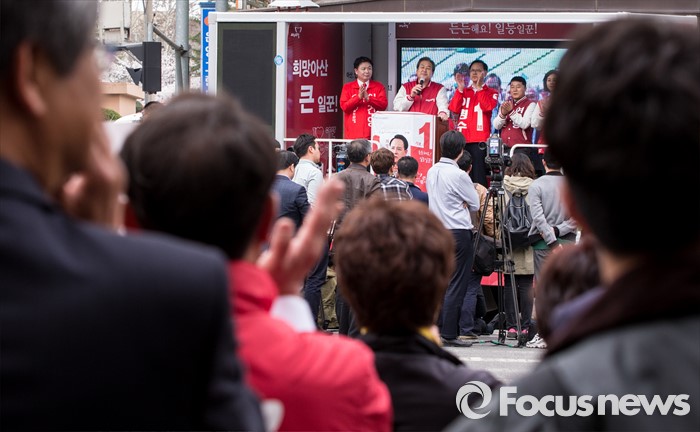 (아산=포커스뉴스) 6일 오후 충남 아산 충무로에서 이명수 새누리당 아산시갑 후보 지원유세에 나선 김무성 대표가 유권자들에게 지지를 호소하고 있다.