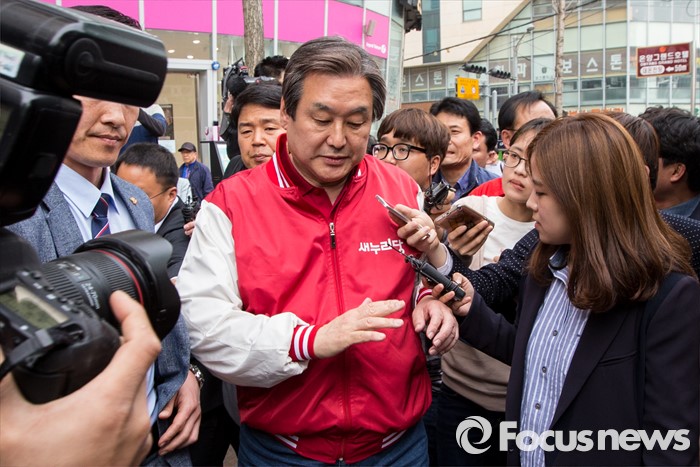 (아산=포커스뉴스) 6일 오후 충남 아산 충무로에서 이명수 새누리당 아산시갑 후보 지원유세에 나선 김무성 대표가 지지연설을 마친 후 버스로 향하고 있다.