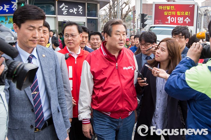 (아산=포커스뉴스) 6일 오후 충남 아산 충무로에서 이명수 새누리당 아산시갑 후보 지원유세에 나선 김무성 대표가 지지연설을 마친 후 버스로 향하고 있다.