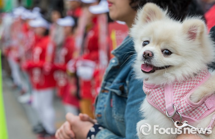 (아산=포커스뉴스) 6일 오후 충남 아산 충무로에서 열린 이명수 새누리당 아산시갑 후보 지원유세에서 개를 안은 시민이 연설을 듣고 있다.