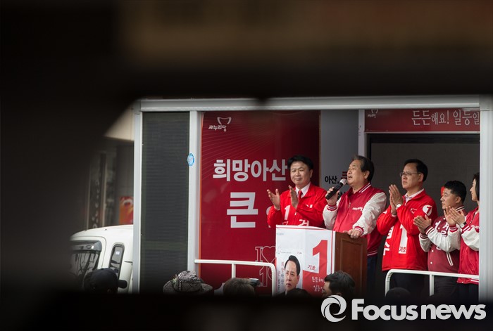(아산=포커스뉴스) 6일 오후 충남 아산 충무로에서 이명수 새누리당 아산시갑 후보 지원유세에 나선 김무성 대표가 유권자들에게 지지를 호소하고 있다.
