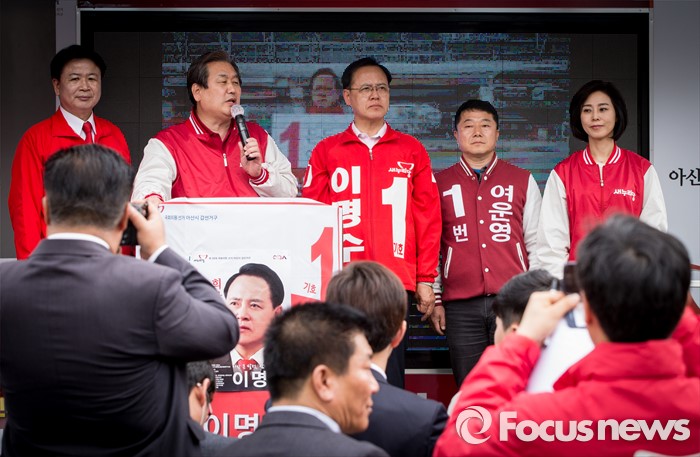 (아산=포커스뉴스) 6일 오후 충남 아산 충무로에서 이명수 새누리당 아산시갑 후보 지원유세에 나선 김무성 대표가 유권자들에게 지지를 호소하고 있다.