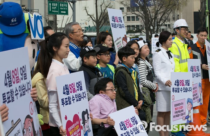 (서울=포커스뉴스) 김종인 더불어민주당 비대위 대표 겸 선대위원장이 6일 오후 서울 광화문광장에서 정세균 종로구 후보, 비례대표 후보, 창원 봉강초등학교 학생들과 20대 총선 사전투표 캠페인을 하고 있다.