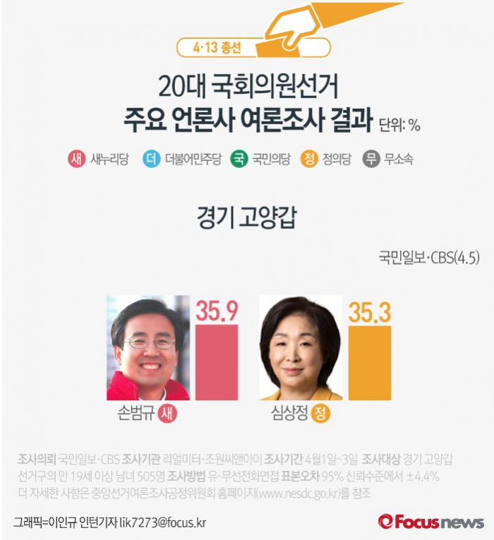 (서울=포커스뉴스) 국민일보·CBS가 여론조사기관 리얼미터·조원씨앤아이에 의뢰해 5일 발표한 결과에 따르면 경기 고양갑에서 새누리당 손범규 후보의 지지율은 35.9%, 정의당 심상정 후보의 지지율은 35.3%인 것으로 나타났다.