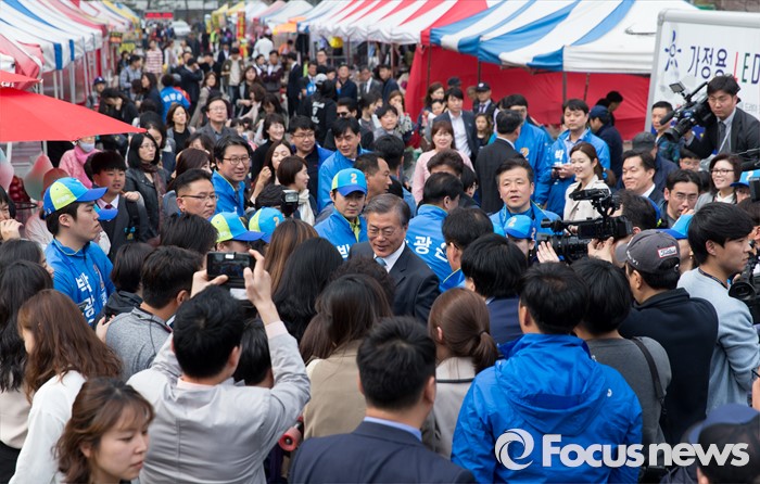 (수원=포커스뉴스) 6일 오후 경기 수원시 영통구 매탄1동 주민센터 앞에서 문재인 더불어민주당 전 대표가 박광온 더민주 수원시정 후보 지원유세를 하고 있다.