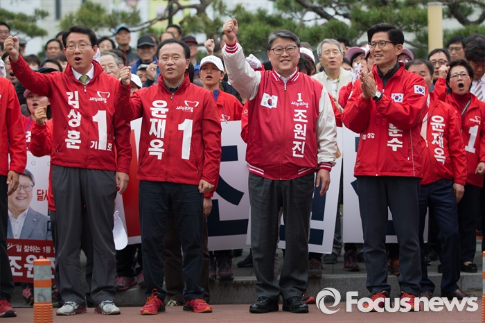 (대구=포커스뉴스) 새누리당 대구지역 후보자들이 6일 오후 대구광역시 달서구 성당동 일대에서 대구지역 후보자 총집결 거리유세를 하고 있다. 오른쪽부터 김문수 수성구갑 후보, 조원진 달서구병 후보, 윤재옥 달서구을 후보, 김상훈 서구 후보