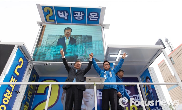 (수원=포커스뉴스) 6일 오후 경기 수원시 영통구 매탄1동 주민센터 앞에서 문재인 더불어민주당 전 대표가 박광온 더민주 수원시정 후보 지원유세를 하고 있다.