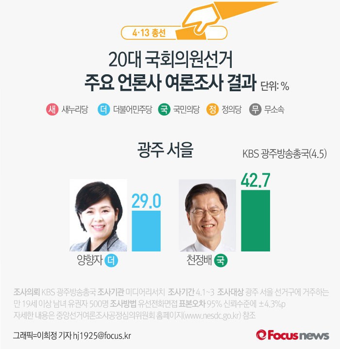 (서울=포커스뉴스) KBS 광주방송총국이 미디어리서치에 의뢰해 5일 발표한 광주 서을 여론조사 결과에 따르면 더불어민주당 양향자 후보의 지지율은 29.0%, 국민의당 천정배 후보는 42.7%를 기록했다.