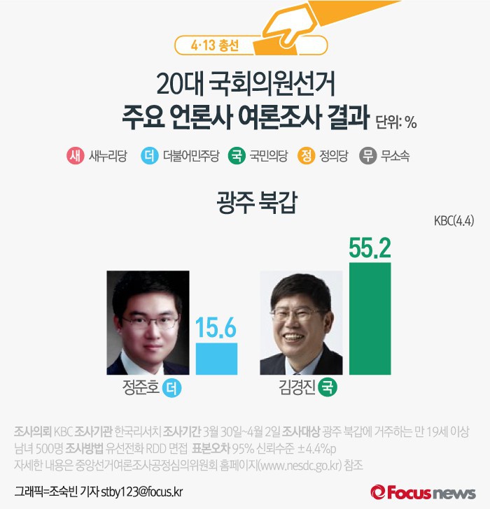 (서울=포커스뉴스) KBC가 한국리서치에 의뢰해 4일 발표한 결과에 따르면 광주 북갑에서 더민주 정준호 후보의 지지율은 15.6%, 국민의당 김경진 후보의 지지율은 55.2%인 것으로 나타났다.