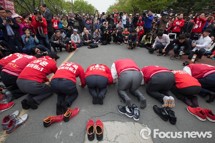 (대구=포커스뉴스) 새누리당 대구지역 후보자들이 6일 오후 대구광역시 달서구 성당동 일대에서 열린 대구지역 후보자 총집결 거리유세에서 새누리당의 부족한 부분에 대해 사죄하고 있다.