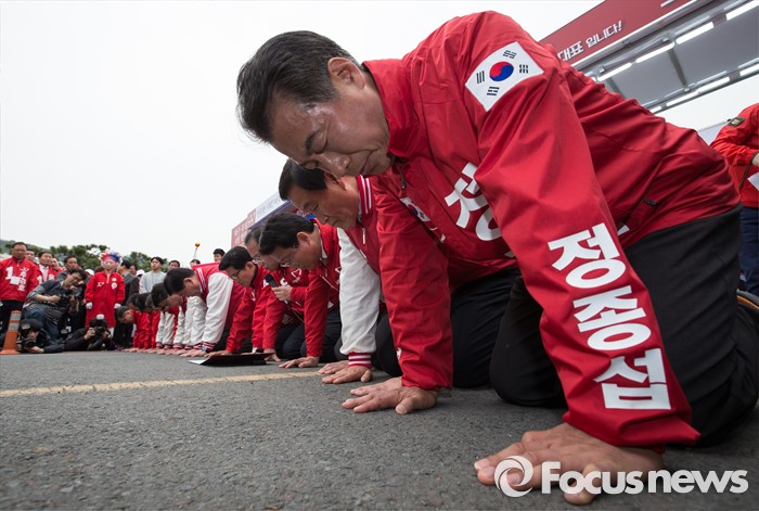 (대구=포커스뉴스) 새누리당 대구지역 후보자들이 6일 오후 대구광역시 달서구 성당동 일대에서 열린 대구지역 후보자 총집결 거리유세에서 새누리당의 부족한 부분에 대해 사죄하고 있다.