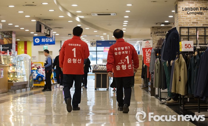 (인천=포커스뉴스) 제20대 총선에 출마한 윤형선 새누리당 계양을 후보가 6일 오후 인천 계양구 홈플러스 계산점에서 선거운동을 하고 있다.