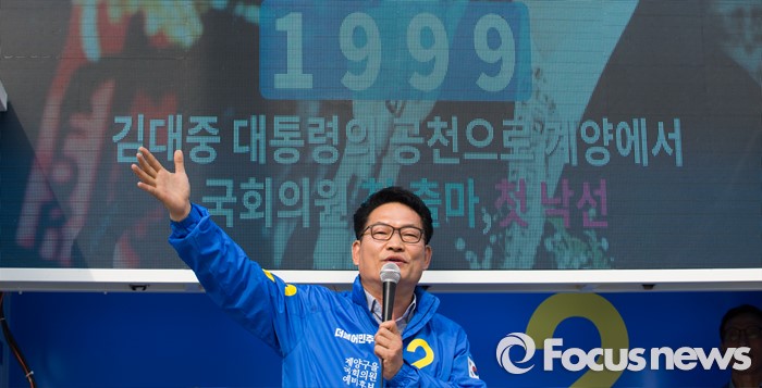 (인천=포커스뉴스) 제20대 총선에 출마한 송영길 더불어민주당 계양을 후보가 6일 오후 인천 계양구 계산역 앞에서 선거운동을 하고 있다.