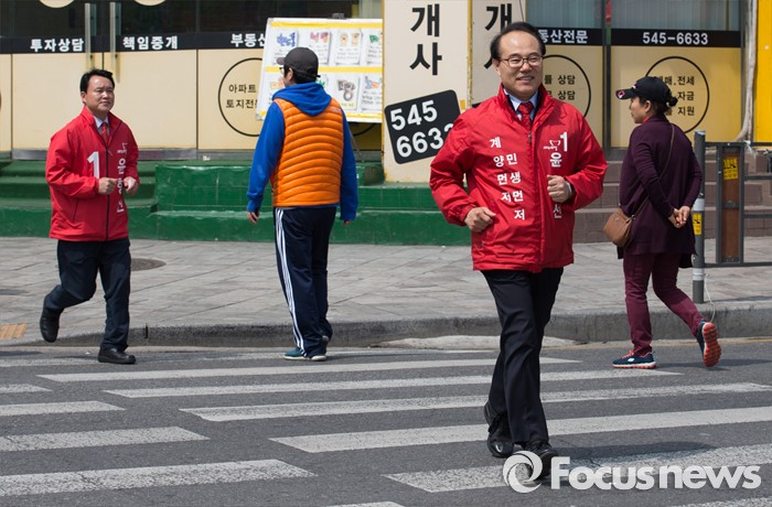 (인천=포커스뉴스) 제20대 총선에 출마한 윤형선 새누리당 계양을 후보가 6일 오후 인천 계양구 홈플러스 계산점에서 선거운동을 하고 있다.