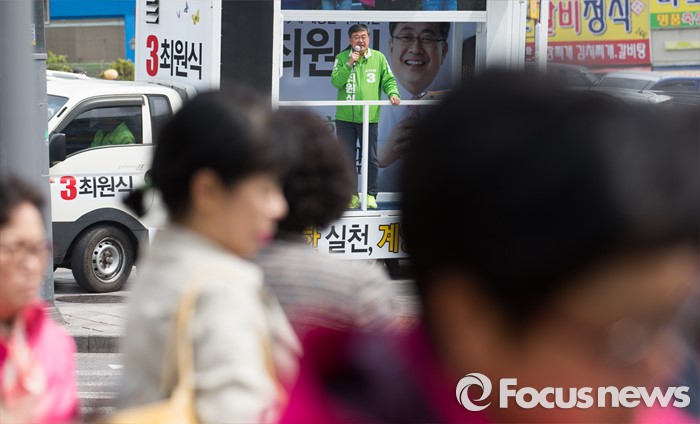 (인천=포커스뉴스) 제20대 총선에 출마한 최원식 국민의당 계양을 후보가 6일 오후 인천 계양구 계산역 앞에서 선거운동을 하고 있다.