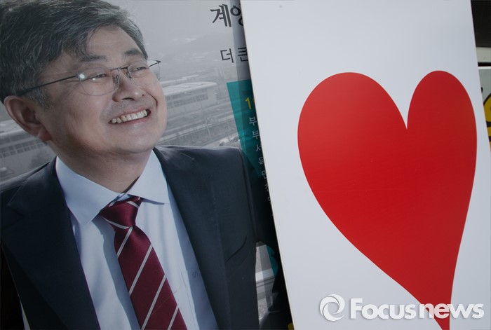 (인천=포커스뉴스) 6일 오후 인천 계양구 계산역 앞에서 제20대 총선에 출마한 최원식 국민의당 계양을 후보의 손피켓이 놓여져 있다.