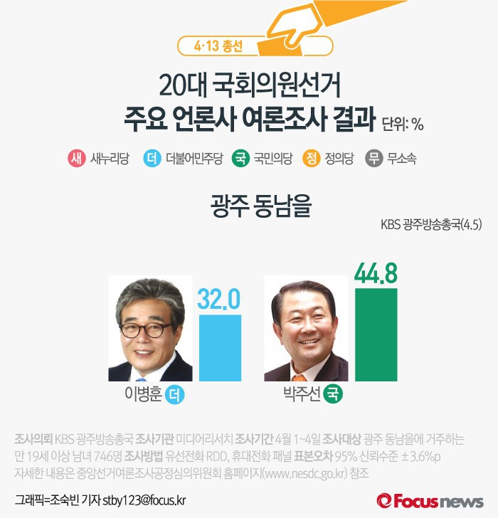 (서울=포커스뉴스) KBS 광주방송총국이 미디어리서치에 의뢰해 5일 발표한 결과에 따르면 광주 동남을에서 더민주 이병훈 후보의 지지율은 32.0%, 국민의당 박주선 후보의 지지율은 44.8%인 것으로 나타났다.
