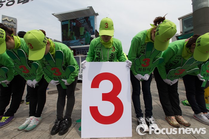 (인천=포커스뉴스) 제20대 총선에 출마한 최원식 국민의당 계양을 후보의 선거운동원들이 6일 오후 인천 계양구 계산역 앞에서 시민들에게 인사하고 있다.