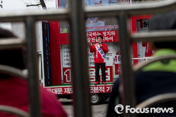 (서울=포커스뉴스) 허용범 새누리당 동대문구갑 후보가 6일 오후 서울 동대문구 제기동 일대에서 유권자들에게 소중한 한 표를 호소 하고 있다.