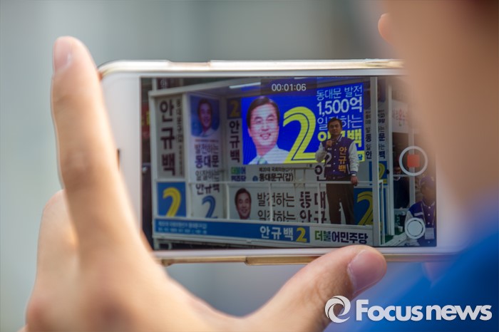 (서울=포커스뉴스) 안규백 더불어민주당 동대문구갑 후보가 6일 오후 서울 동대문구 휘경동 일대에서 유권자들에게 소중한 한 표를 호소 하고 있다.