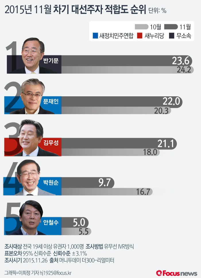 머니투데이 더300-리얼미터에서 조사한 2015년 11월 월간 정례 19대 차기 대통령 국가과제 실현 적합도 조사는 지난 26일에 전국 19세 이상 유권자 1,000명을 대상으로 자동응답전화(IVR, interactive voice response) 방식으로 무선전화(50%)와 유선전화(50%) 병행 RDD방법으로 조사했고, 통계보정은 행정자치부 주민등록 인구통계에 따른 성, 연령, 권역별 가중치 부여 방식으로 이루어졌다. 표본오차는 95% 신뢰수준에서 ±3.1%p, 응답률은 5.7%이다.