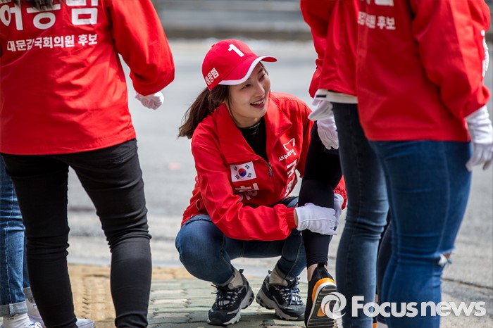 (서울=포커스뉴스) 6일 오후 서울 동대문구 제기동 일대에서 허용범 새누리당 동대문구갑 후보 선거운동원들이 선거운동에 앞서 서로의 다리를 주물러 주고 있다.