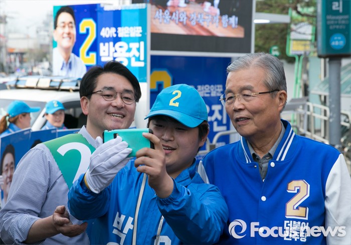 (서울=포커스뉴스) 6일 오후 서울 롯데백화점 미아점 앞에서 김종인(오른쪽) 더불어민주당 비대위 대표 겸 선대위원장과 박용진(왼쪽) 강북을 후보가 유세를 마친 뒤 선거운동원과 기념촬영을 하고 있다.