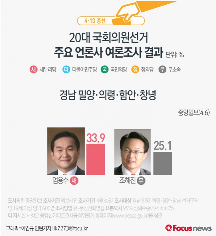 (서울=포커스뉴스) 중앙일보가 여론조사기관 엠브레인에 의뢰해 6일 발표한 결과에 따르면 경남 밀양 의령 함안 창녕에서 새누리당 엄용수 후보의 지지율은 33.9%, 무소속 조해진 후보 지지율은 25.1%인 것으로 나타났다.