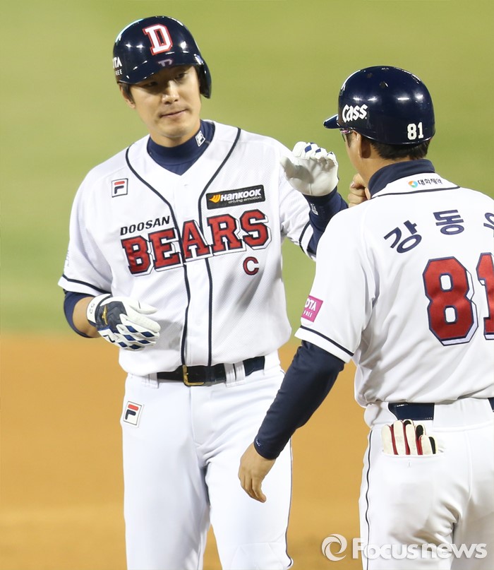 (서울=포커스뉴스) 6일 서울 잠실구장에서 열린 2016 프로야구 NC-두산 경기 2회말 2사 1,3루에서 두산 김재호가 1타점 우전안타를 치고 1루에서 강동우 코치와 손을 마주치고 있다.
