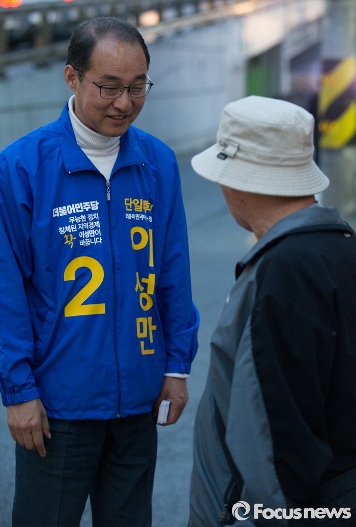 (인천=포커스뉴스) 제20대 총선에 출마한 이성만 더불어민주당 부평갑 후보가 6일 오후 인천 부평구 부개역 인근에서 선거운동을 하고 있다.