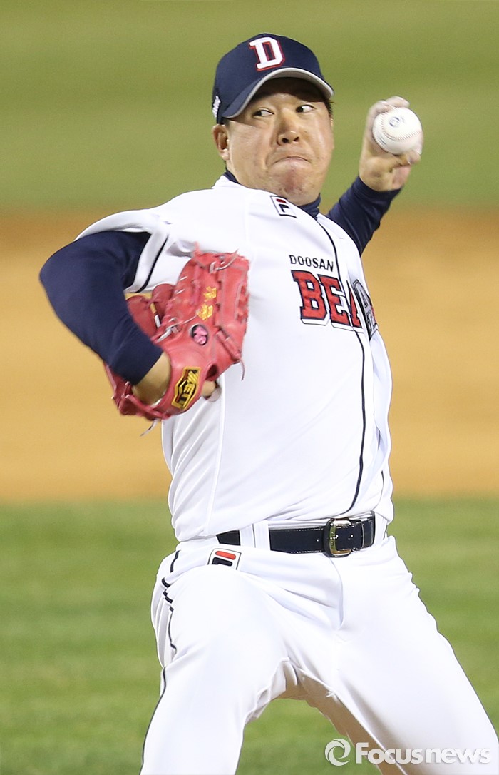 (서울=포커스뉴스) 6일 서울 잠실구장에서 열린 2016 프로야구 NC-두산 경기에서 9회말 등판한 두산 마무리 투수 이현승이 온 힘을 다해 투구하고 있다.