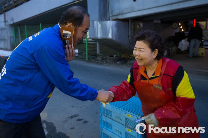 (인천=포커스뉴스) 제20대 총선에 출마한 이성만 더불어민주당 부평갑 후보가 6일 오후 인천 부평구 부개역 인근에서 선거운동을 하고 있다.