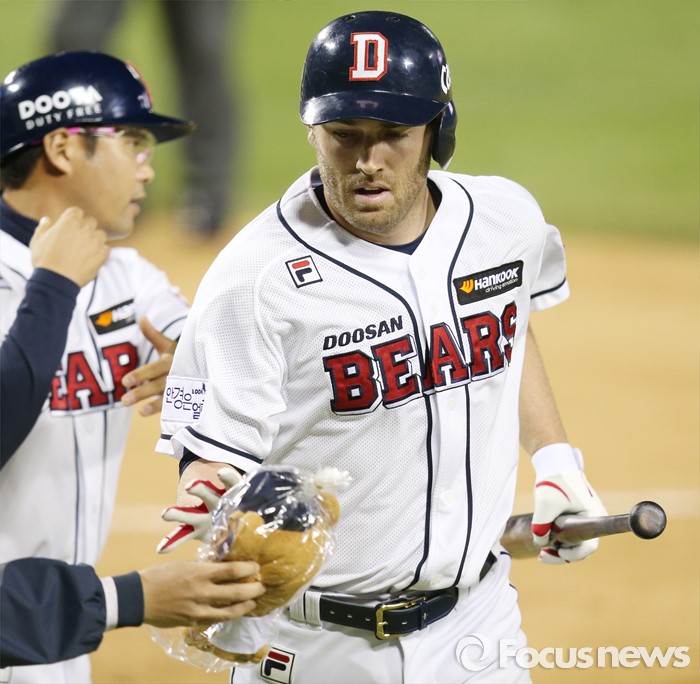 (서울=포커스뉴스) 6일 서울 잠실구장에서 열린 2016 프로야구 NC-두산 경기 6회말 1사후 두산 에반스가 우월 1점 홈런을 치고 홈인하며 인형 선물을 받고 있다.