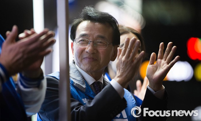 (서울=포커스뉴스) 6일 오후 서울 강동구 이마트 앞에서 김종인 더불어민주당 비대위 대표가 심재권 후보와 함께 유세를 펼치고 있다.