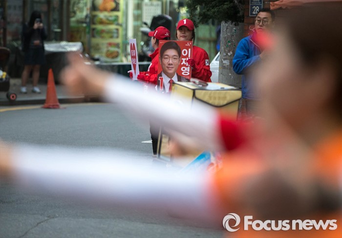 (서울=포커스뉴스) 6일 오후 서울 강동구 천호동 인근의 한 아파트 앞에서 이재영 새누리당 후보가 유세를 펼치고 있다.