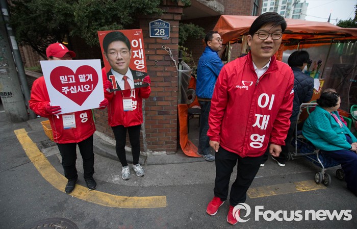 (서울=포커스뉴스) 6일 오후 서울 강동구 천호동 인근의 한 아파트 앞에서 이재영 새누리당 후보가 유세를 펼치고 있다.